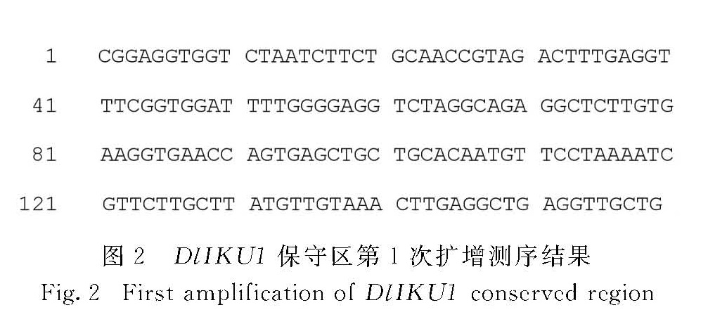 以gDNA为模板,用DlIKU1保守区的引物进行PCR扩增.1%琼脂糖凝胶电泳检测,割胶纯化目的片段,与pMD19-T载体进行TA克隆,转化DH5α感受态细胞.获得的阳性克隆提取质粒送样测序,结果如图2所示.
