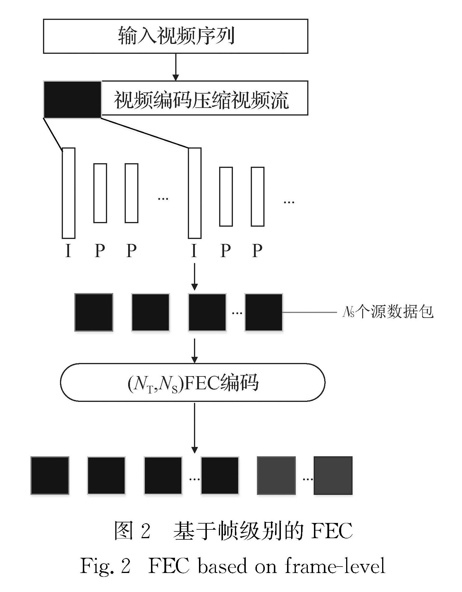 2)常用于抵抗视频数据丢包的FEC有基于sub-GOP级别[9]和GOP级别[10]2种,接收端在接收到一个GOP才能进行译码恢复丢包,时延较高.传统帧级别[15]的FEC则对每个数据帧都采用相同码率的FEC编码.在这种方案中,具有较多编码源数据包的I帧比编码源数据包少的P帧的译码性能更好.