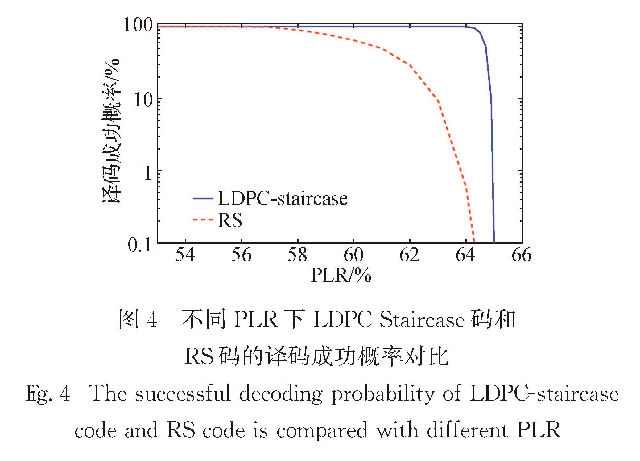 图4为RS码和LDPC-staircase在不同的丢包率情况下的译码成功概率.其中,LDPC-staircase的RC为1/3,RS码使用伽罗瓦域为GF(28).当PLR(RPL)约为57%时,RS码的译码成功概率开始下降,而LDPC-staircase码的译码成功概率依然保持在接近100%的水平.在PLR约为64%时,LDPC-staircase码的译码成功概率略有下降,而此时,RS码的译码成功概率远低于LDPC-staircase码.