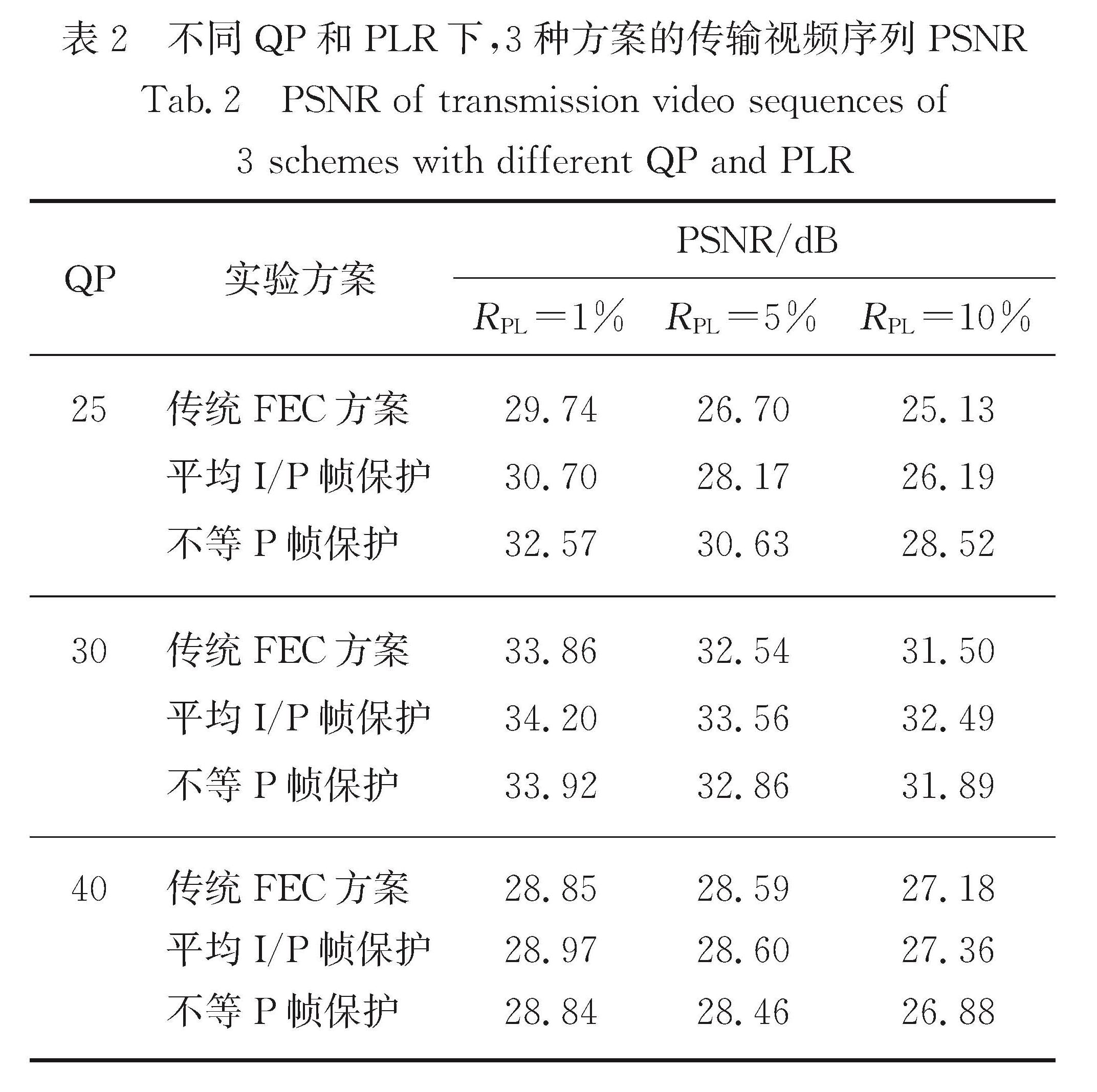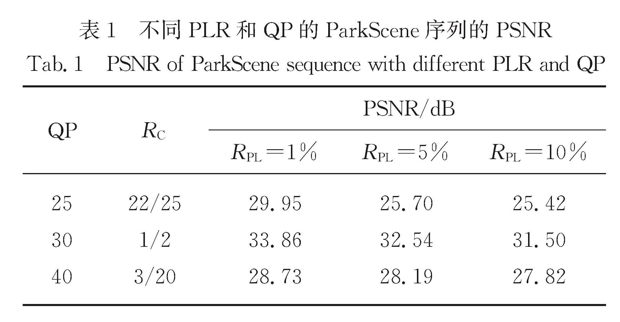 本实验将QP设为25,30和40进行仿真.以QP为30,FEC信道编码码率RC为1/2时传输的数据包总数NT为标准,调整QP为25和40的FEC的RC.测试PLR为1%,5%和10%时,不同QP下传统FEC方案传输视频重构的PSNR(表1).可以看出:在3种PLR情况下,QP为30的ParkScene视频序列的PSNR均最大,即接收端视频的重构效果最好; 当PLR为1%时,QP为25的视频PSNR大于QP为40的PSNR; 当PLR为5%和10%时,QP为40的视频PSNR则比QP为25的大.