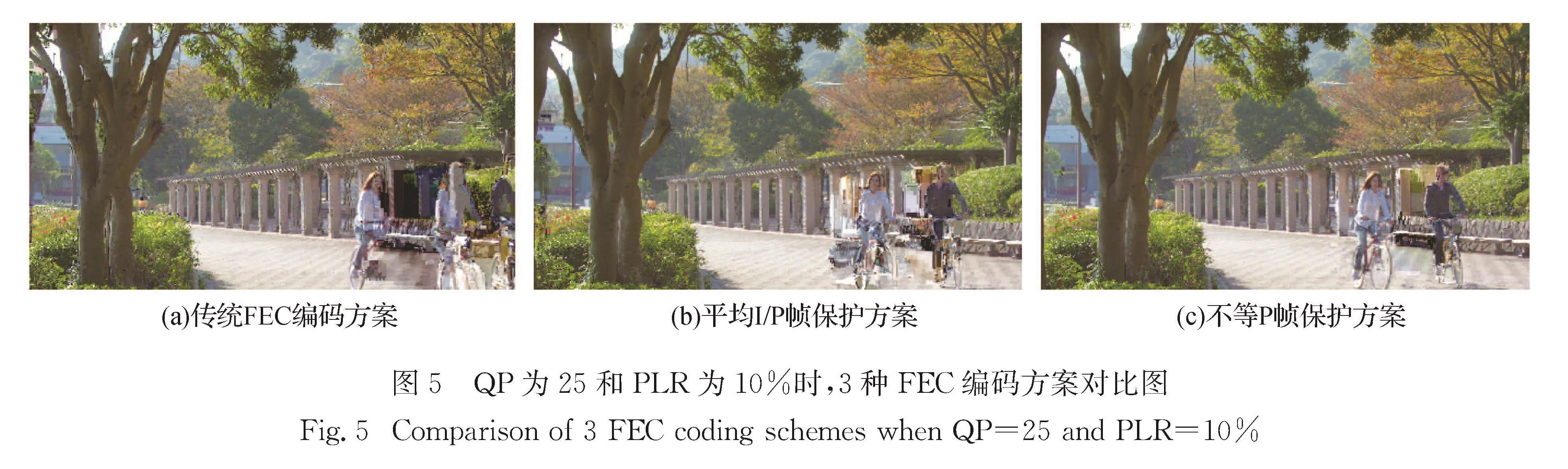 如图5所示为PLR为10%和QP为25时,在接收端收到的解码后的视频画面,可以看到,不等P帧保护方案具有最好的视频重构效果,平均I/P帧保护方案的视频重构质量次之.