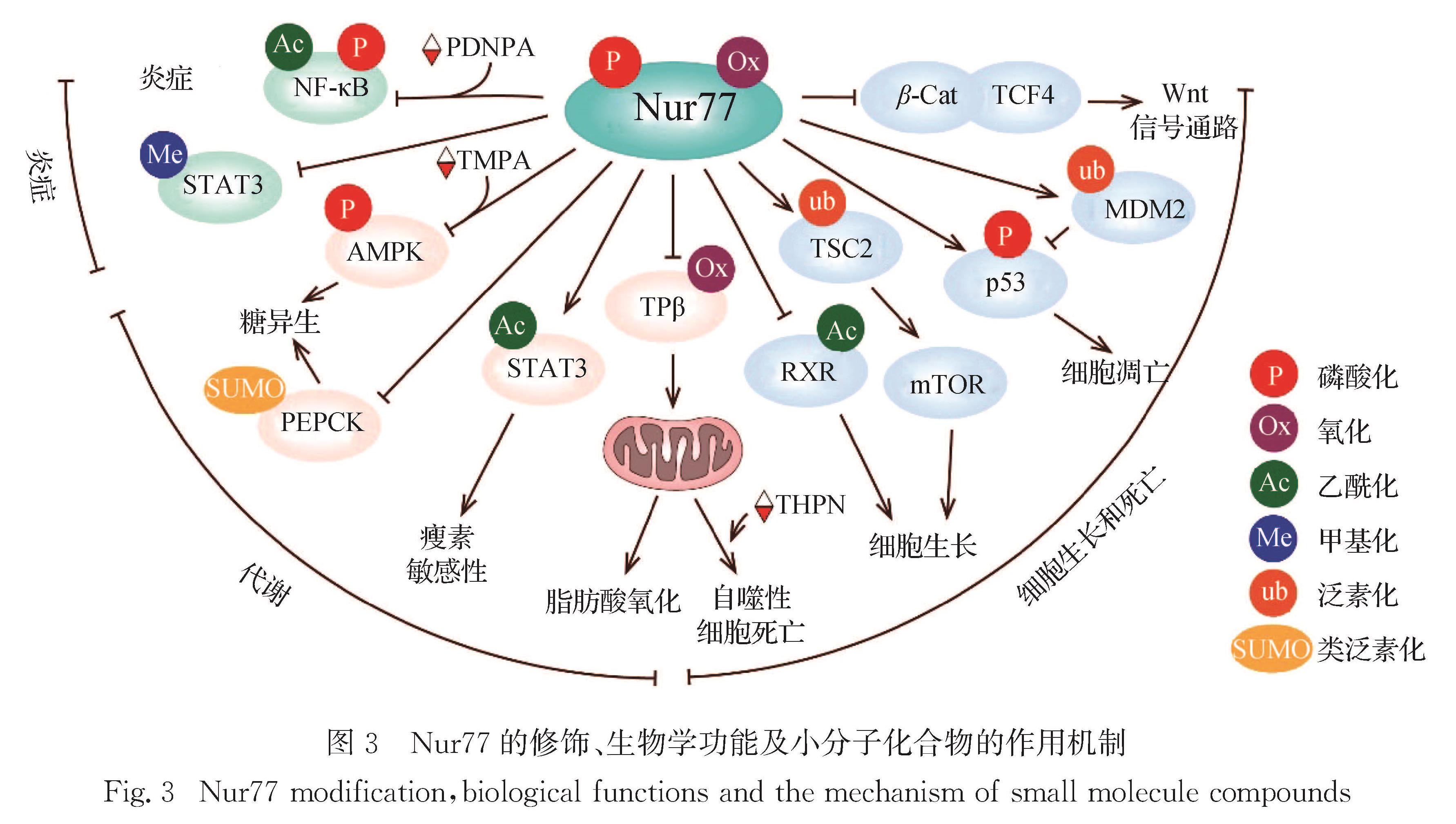 常见的蛋白修饰包括磷酸化、乙酰化、泛素化、SUMO化、甲基化、氧化、糖基化等; 此外,顺反式异构化和二磷酸腺苷(ADP)-核糖基化也是重要的蛋白修饰方式.Nur77蛋白的翻译后修饰对其发挥生物学功能具有重要影响,如转录激活、蛋白相互作用、亚细胞定位、蛋白稳定性等.