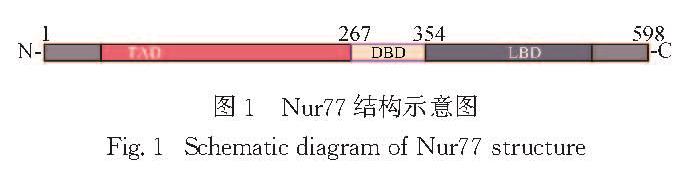 Nur77具有类固醇/甲状腺/维甲酸受体超家族的典型结构特征,由氨基端的转录激活域(transcription-activating domain,TAD)、中部的DNA 结合域(DNA-binding domain,DBD)以及羧基端的配体结合域(ligand-binding domain,LBD)组成(图1).其中,TAD是Nur77发挥转录激活作用的区域[13].DBD负责特异性识别单体Nur77 的应答元件(NGFI-B response element,NBRE)或者同源/异源二聚体形式的Nur77应答元件(Nur77 response element,NurRE),从而调控下游基因的转录; 且DBD包含两个核定位信号(nuclear localization signal,NLS)序列,能够影响Nur77的亚细胞定位[14-15].虽然目前并未发现Nur77的内源性配体,但是其结构上仍具备LBD,且LBD还具有调控Nur77转录激活活性、二聚化形成和亚细胞定位的功能[14,16].