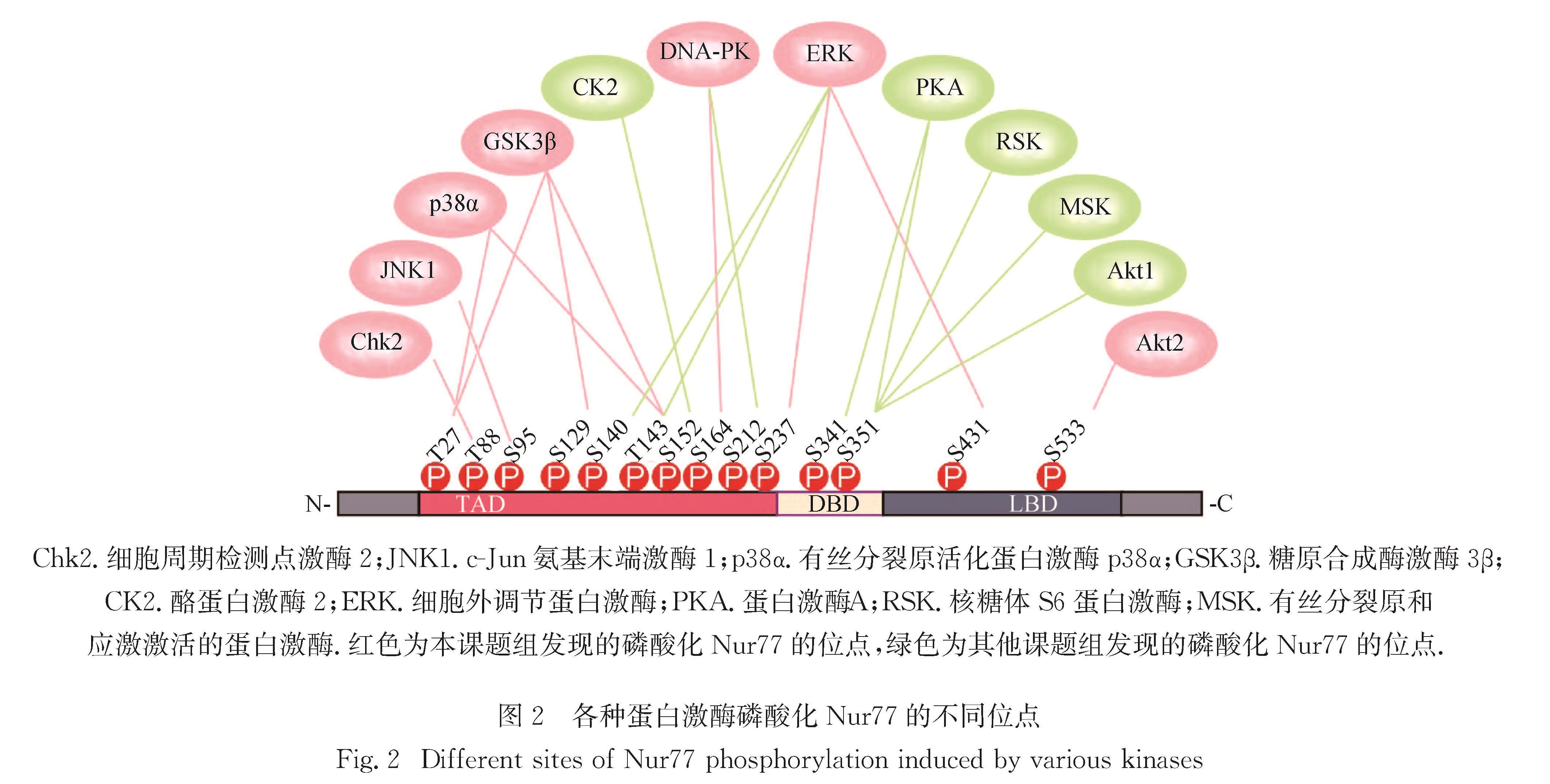 应激激活的蛋白激酶.红色为本课题组发现的磷酸化Nur77的位点,绿色为其他课题组发现的磷酸化Nur77的位点.