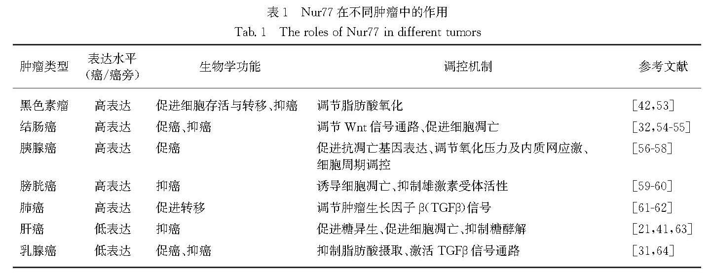 Nur77与肿瘤的发生发展密切相关.在不同的肿瘤组织中,Nur77表达水平存在差异,其中Nur77在黑色素瘤、结肠癌、胰腺癌、膀胱癌组织中高表达,而在肝癌、乳腺癌组织中低表达; 而且Nur77在不同的肿瘤中发挥的功能有所不同,甚至在同种肿瘤的不同亚型或不同发展时期功能也有差异(表1).