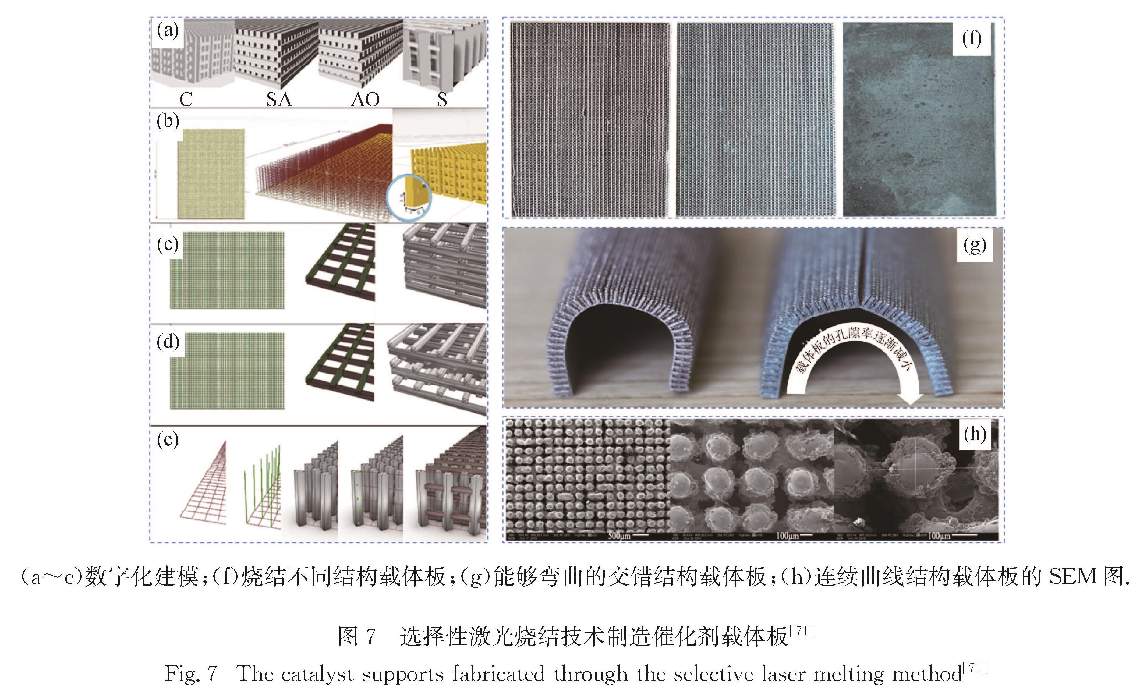 在3D打印金属催化剂载体方面有关学者也做了一些前期尝试,本课题组提出了一种基于参数化建模和选择性激光烧结工艺的催化剂载体板制造方法(图7),通过参数化建模建立了连续曲线结构(C,图7(b))、简单阵列结构(SA,图7(c))、阵列偏移结构(AO,图7(d))和交错结构(S,图7(e)),利用选择性激光烧结技术实现了不同结构的载体板制造,探究了不同结构载体板对于甲醇重整制氢微反应器性能的影响; 实验结果表明,交错结构式载体板具有较高的产氢效率,同时交错式载体板能实现自身的弯曲,有利于催化剂粉末的脱落和负载[71].该实验工作为进一步优化催化剂载体板结构、载体板的低成本制造提供了参考.