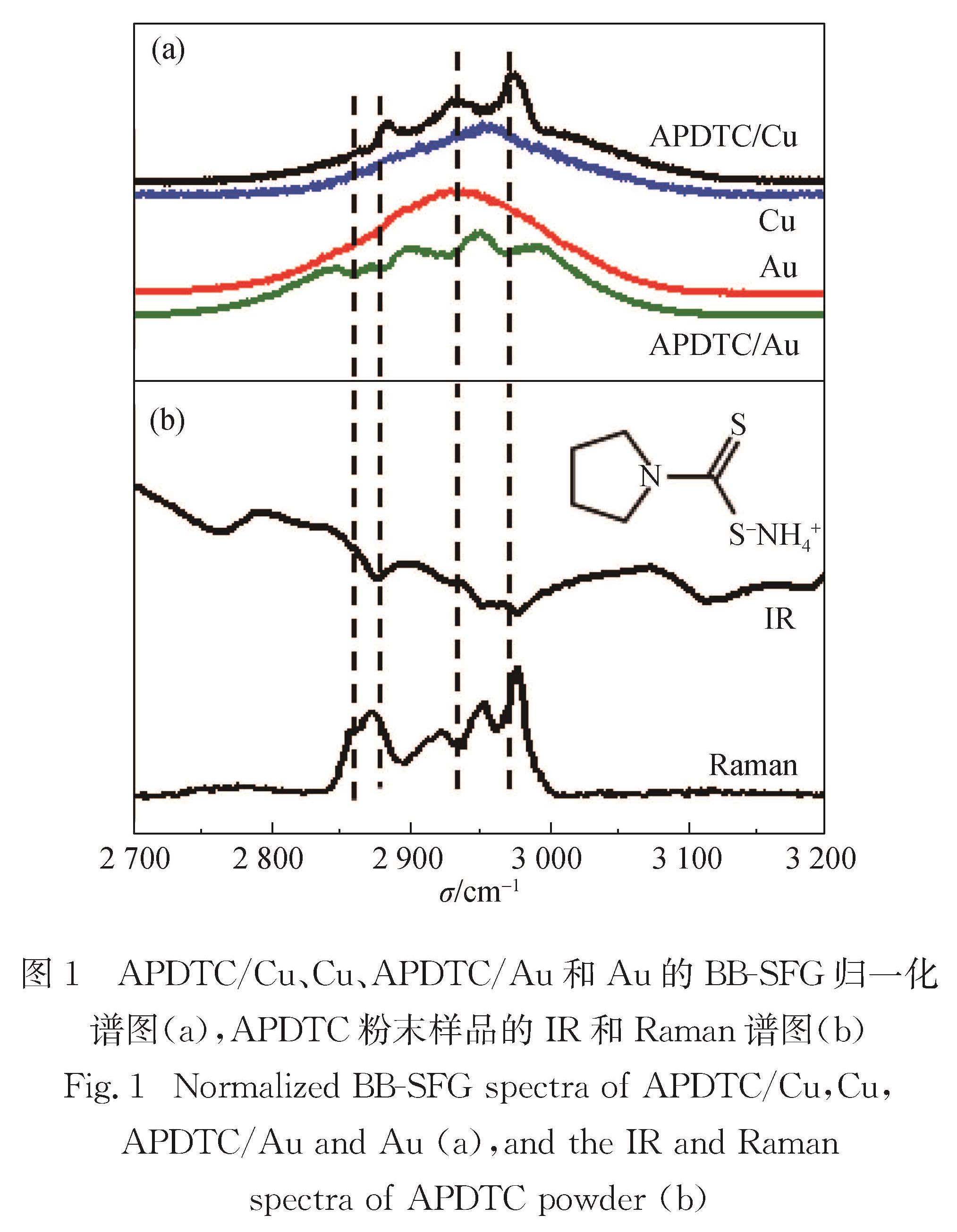 图1 APDTC/Cu、Cu、APDTC/Au和Au的BB-SFG归一化谱图(a),APDTC粉末样品的IR和Raman谱图(b)