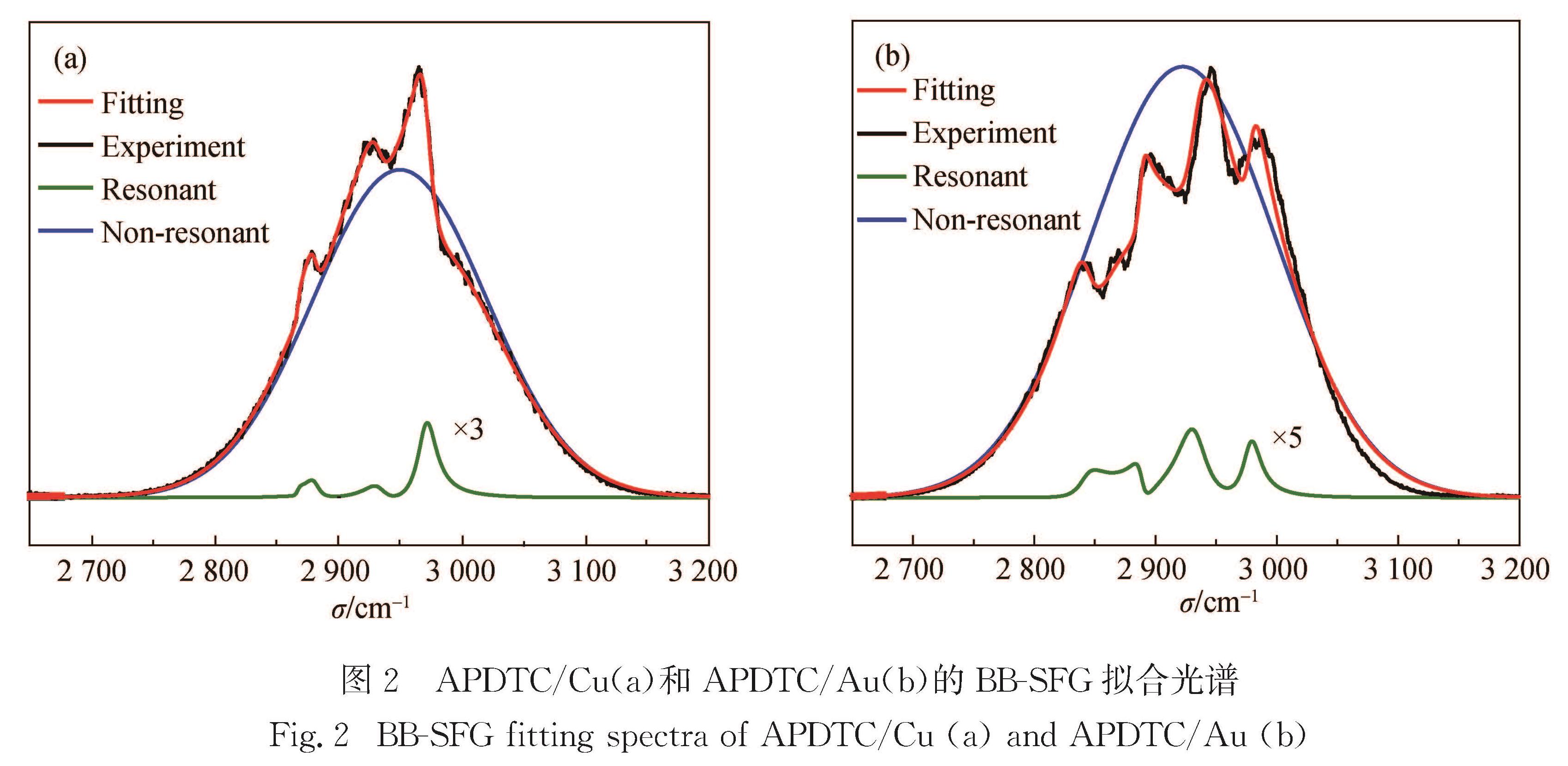 本研究利用BB-SFG分析Cu和Au表面吡咯烷二硫代甲酸铵(APDTC)SAM,通过数值拟合解析了共振谱峰的相位,用X射线衍射(XRD)仪检测了Cu和Au表面的结构,并依据实验结果给出了可能的吸附构型.