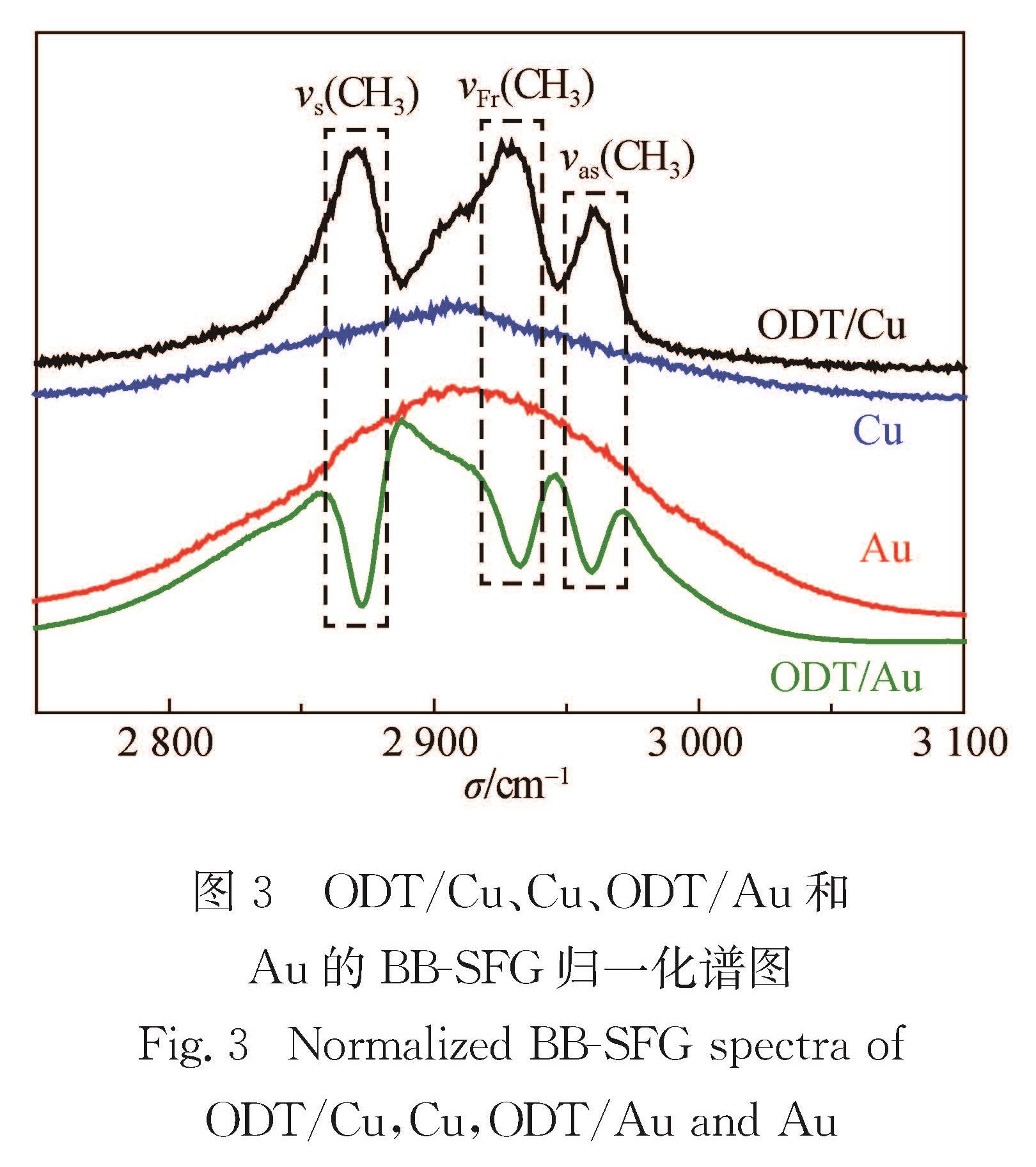 由于分子振动偶极取向和基底的相位均会影响SFG线型.采用一个已知分子取向的SAM来进一步考察线型差异的来源.在Au和Cu表面,十八硫醇(ODT)都是以—S端吸附的形式成膜; 尽管碳链的倾斜角度有一定差异,但碳链末端甲基的C—H伸缩振动的偶极在垂直表面方向的分量,无论在Cu表面还是Au表面都一样[29].图3给出了ODT分子的BB-SFG谱图,可以看出:在Cu表面,ODT分子SFG共振谱峰为正峰; 而在Au表面,分子SFG共振谱峰为负峰,表现出与APDTC类似的线型差异.由此认为,SFG共振谱峰线型变化不是由分子取向差异造成的,而是由基底不同引起的.
