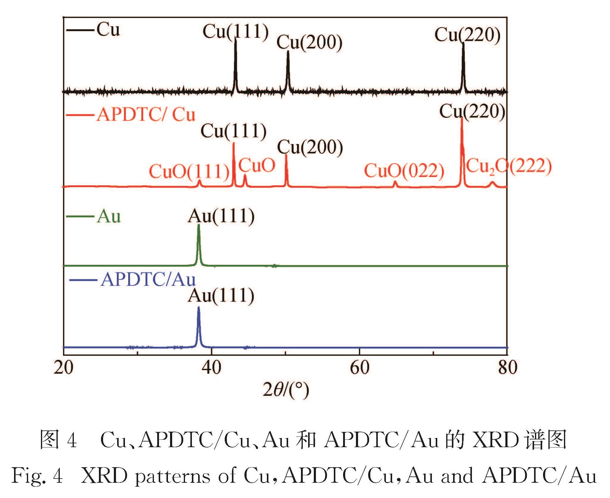 图4给出了几个样品的XRD谱图: Cu与APDTC/Cu均在 43.4°,50.5°和74.1°处有明显的特征峰,分别对应于Cu立方闪锌矿结构的(111)、(200)和(220)晶面(标准卡片:01-089-2138).此外,APDTC/Cu 在38.4°和64.9°处的特征峰分别对应于CuO的(111)和(022)晶面(标准卡片:01-089-2531),77.9°的特征峰对应于Cu2O立方闪锌矿结构的(222)晶面(标准卡片:01-077-0199),44.7°对应于CuO的特征峰(标准卡片:00-044-0706).这表明APDTC/Cu表面在自组装过程中发生了自发氧化.而Au与APDTC/Au均在38.2°处有明显的特征峰,对应于Au 立方闪锌矿结构的(111)晶面(标准卡片:03-065-2870),没有检测到氧化峰.氧化后的表面电子结构明显与纯金属表面不同,铜氧化物和Au表面SFG信号的绝对相位不同,造成了分子与基底相对相位的差异,使APDTC分子SFG共振谱峰分别表现为正峰和负峰.