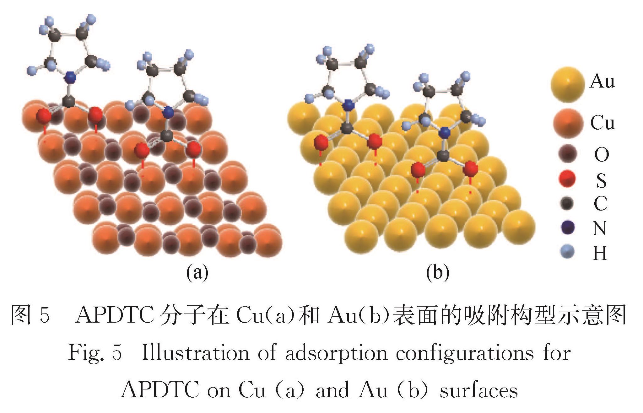 图5 APDTC分子在Cu(a)和Au(b)表面的吸附构型示意图