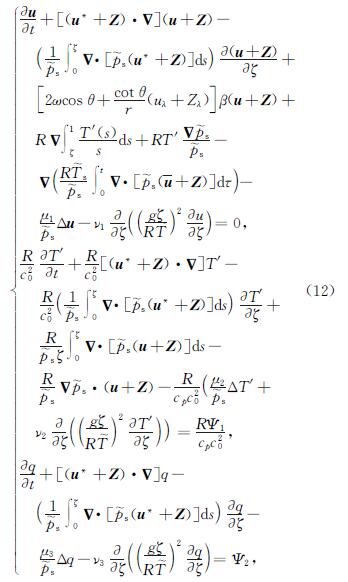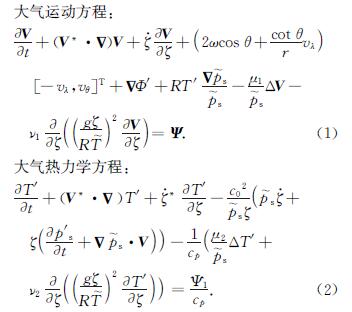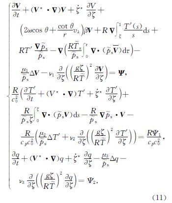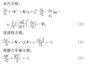 其中,Co,Cp,R是热力学常数,ui,vi(i=1,2,3)是耗散系数,g是重力加速度,w是地球自转角速度,Ψ1表示单位时间内大气从外界获得的热量,Ψ2表示水汽相变过程中液态水的变化量.