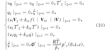 参考文献[2]中的方法,将p ~sV^-分解为p ~sV^-=Δχ+Δψ⊥,可得V*=V-p ~-1sΔχ=(v*θ,v*λ),ζ ·*=-p ~-1s∫ζ0Δ·(p ~sV*)ds,ds是地形坐标中垂直方向上一个微元,并且当ζ=1时,ζ ·*=0.