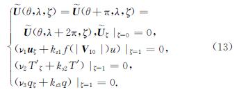 其中:所有关于θ的函数,均以π为周期; 所有关于λ的函数,均以2π为周期; ks1、ks2和ks3均为正常数; V10为给定函数,表示风速10 m/s,且满足V10,V-110∈L∞(S); T ~s(θ,λ)为给定函数,表示地球表面标准温度,且满足T ~s(θ,λ)∈W1,∞(S).关于初边值条件的物理意义可