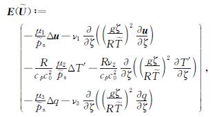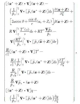 该方程组的状态变量为水平速度场V、气压变化率ζ ·、温度偏差量T'、比湿q、重力位势偏差量Φ'、地表气压偏差量p's.T ~(ζ)为给定的参考标准温度,且满足T ~(ζ),T ~-1(ζ)∈W1,∞(0,1),T ~(ζ)>0,T ~(ζ)=O(ζ); p ~s(θ,λ)为给定的参考标准地球表面气压,且满足p ~s(θ,λ),p ~s-1(θ,λ)∈W1,∞([0,π]×[0,2π]:=S).